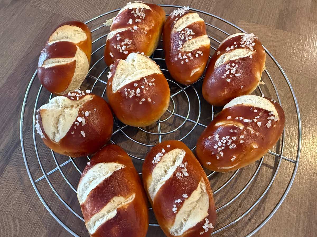 Meine Kinder lieben Laugengebäck genauso wie ich. Ob nun in Stangen-, Brötchen-, Kranz- oder Konfektform – mit diesem Rezept ist alles möglich. Es ist für zehn kleine Stangen ausgelegt und kommt mit einer Stückgare von knapp 24 Stunden.